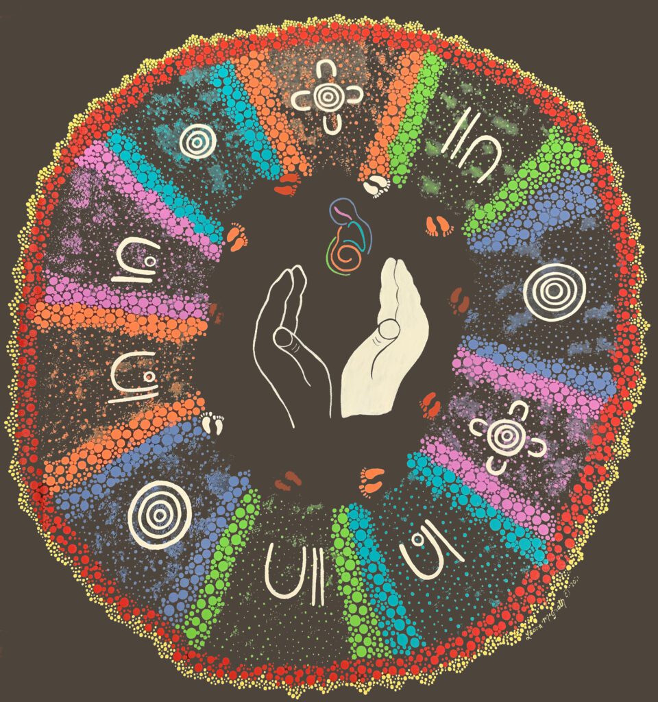 The painting represents the protection, support, and sense of community Indigenous Australian women need throughout their maternity care, including after a baby has passed away.