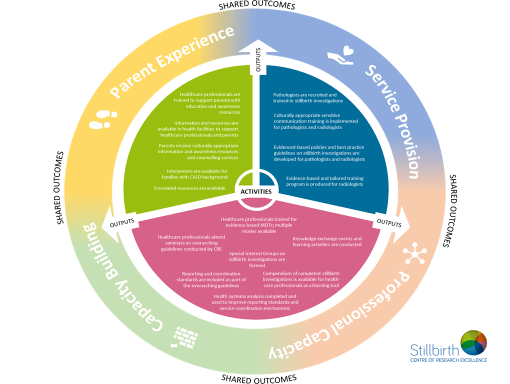 Several initiatives are currently being driven by the Department of Health and Aged Care across Australia as part of the National Stillbirth Action and Implementation Plan to improve stillbirth investigations. These initiatives will occur at similar times and will address different aspects of stillbirth investigations leading to interactions and synergies. The Stillbirth CRE have established a Stillbirth Investigations Collaborative Group with representatives from Red Nose, The Royal Australian New Zealand College of Radiologists (RANZCR), the Royal College of Pathologists of Australasia (RCPA), and Stillbirth Foundation Australia.